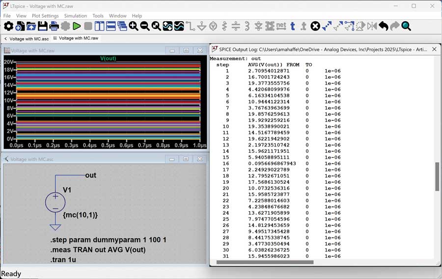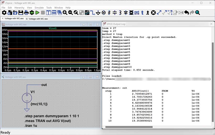 观察mc()函数在每一步迭代中的行为:图2显示了一个仅使用电压源的简单示例。此示例使用mc()将标称电压设置为10 V,并将容差设置为100%。因此,预计将得到一个在0 V和20 V之间均匀分布的电压。从波形查看器和SPICE输出日志中的结果可以看到,在10次迭代中,电压变化范围是2.7 V至19.92 V,分布并不完全均匀,但更多次迭代将有助于确保结果在统计上更加合理。
