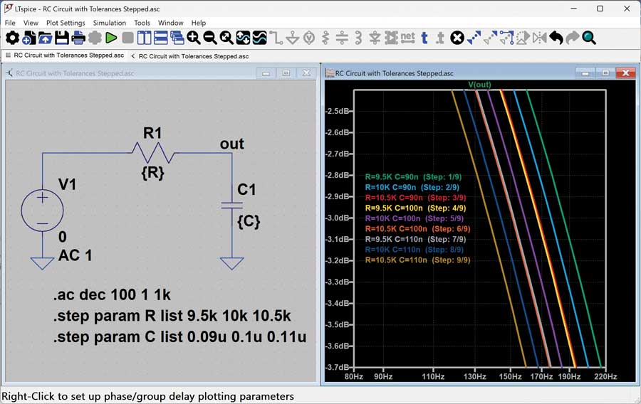 图7所示的例子确保了仿真能够覆盖无源元件容差的所有边缘情况,同时保持总体仿真时间尽可能短。这个例子遍历了R1的三个值和C1的三个值,进行了九次仿真,并覆盖了元件值同时达到最小值(或最大值)的情形。
