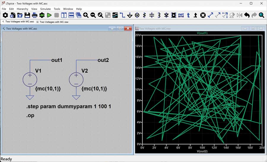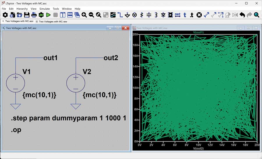 如果电路中多处使用mc()呢?能否保证通过100次迭代能够覆盖所有容差?图5展现了这一尝试,其中显示了两个使用mc()的电压源。将V(out1)作为y轴、V(out2)作为x轴进行绘图,可以清楚地看到,V1和V2的组合呈现出高度随机的坐标分布(右键单击x轴标题,将x轴从步进虚拟参数更改为V(out2))。但从技术上讲,这些电压的最小值和最大值并非同时达到,导致极端(角落)情况的覆盖有些不足。