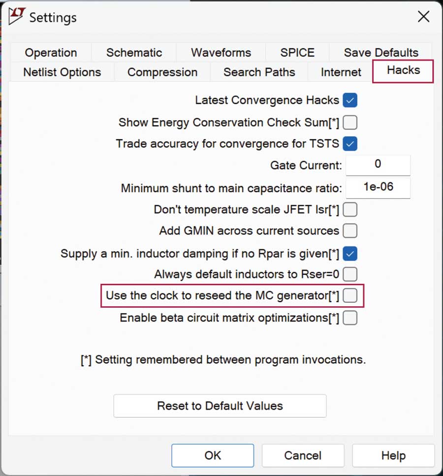这与我们的LTspice仿真有何关系?如果希望每次运行仿真时获得不同的随机值,则必须在设置面板的Hacks部分中启用Use the clock to reseed the MC generator选项(参见图3)。