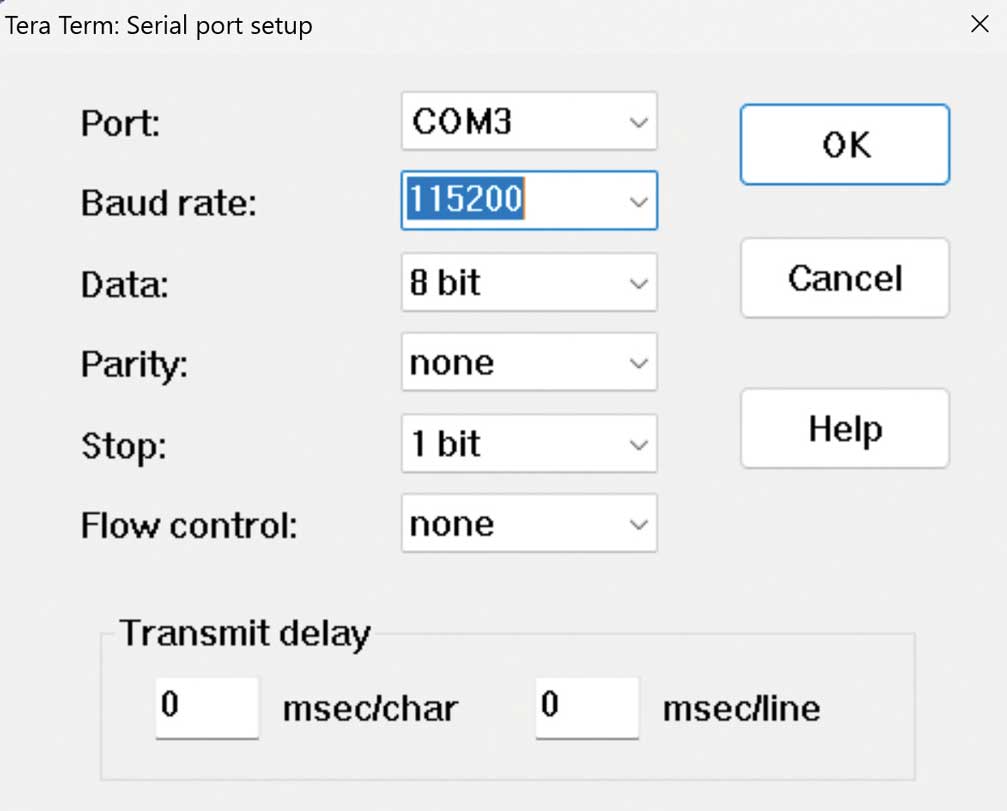 boards.c文件也经过了大量修改,以使PICO能够将数据打印到终端程序(如Tera Term),这对于调试过程非常有用。如果使用打印功能,请配置终端程序以115200的波特率进行通信,如图4所示。