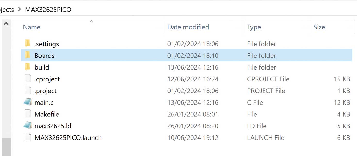 第1部分中创建的项目是围绕MAX32625EVKIT硬件而设计的,该硬件与PICO的硬件不同,因此需要更改评估套件的硬件描述文件以适配PICO的硬件。原始的boards.c文件存储在以下目录中: