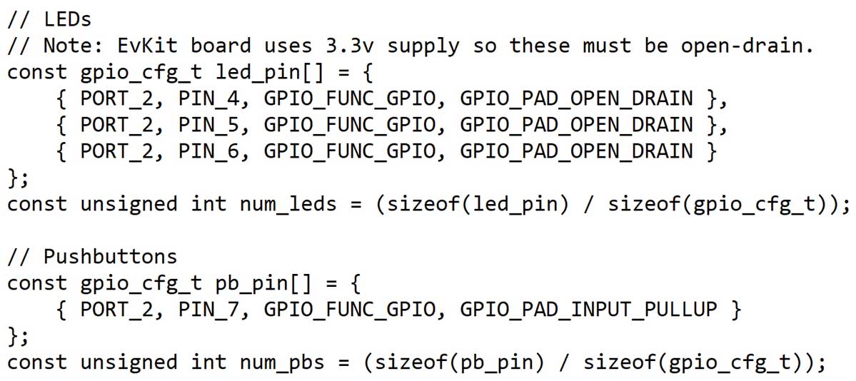 在新的Boards目录中,可以找到修改后的board.c文件(位于目录EvKit_V1\Source),它描述了PICO上的微控制器与LED和按钮的连接关系。通过比较图2中的代码与图3中的PICO原理图,可以很容易看出其结构。
