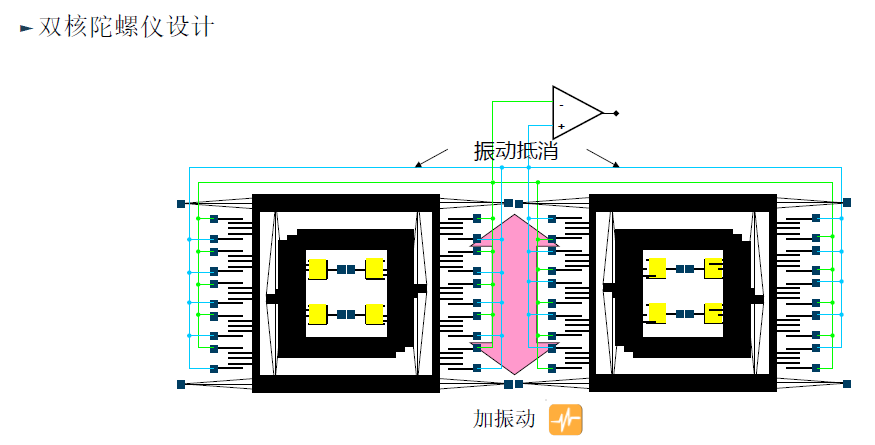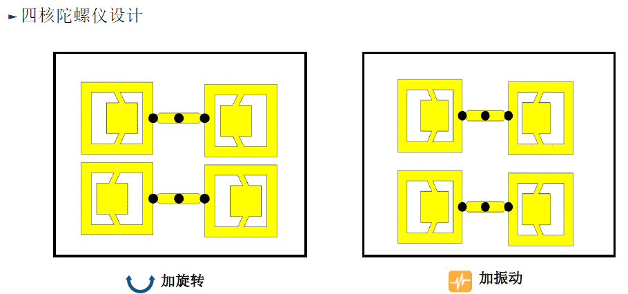 单质量块陀螺仪不能区分旋转(待测量)和与内部谐振器相同频率的振动。外部的振动会那么容易产生与内部谐振器相同的频率吗?答案是肯定的,比如冲击事件,其时域输出是脉冲,相应的频谱成分无限丰富,此时,单质量块陀螺仪即无法区分该事件和实际的旋转角速度。ADXRS系列陀螺仪至少采用两个质量块,它们以相同的频率振荡,但相位相差180°此时冲击和振荡表现为共模输出,所以采用差分操作可以抑制掉很多误差。如下图所示:ADI双质量块陀螺仪和四质量块陀螺仪设计思路。