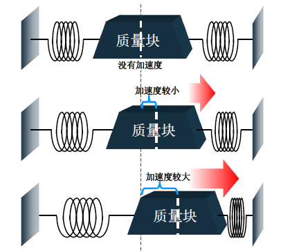加速度计的模型其实是一个由弹簧质量块组成的阻尼系统,当质量块由于惯性作用压缩弹簧的时候会产生弹性力,该弹性力符合胡克定律F=KX,K是弹簧的劲度系数,X是弹簧压缩或者伸长的距离。我们知道力是改变物体运动状态的原因,符合牛顿第二定律F=Ma,M是质量块的质量,a是产生的加速度。这样的话通过联立KX=Ma可推导出加速度a=KX/M,这样我们只要知道X值就可以得出加速度a,因为K和M是定值。