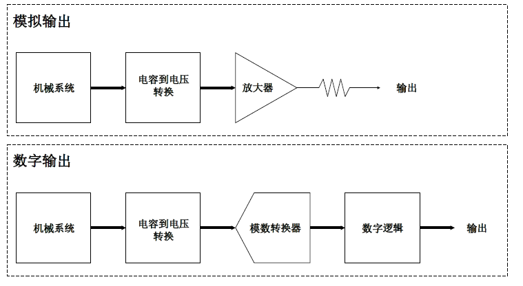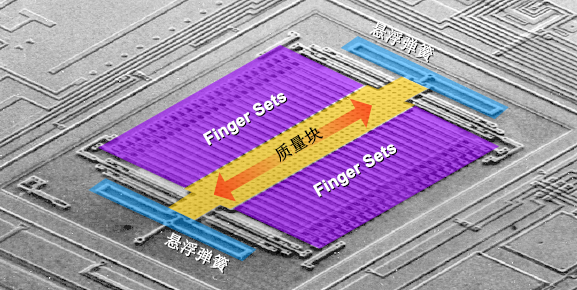 加速度计内部质量块结构都带有伸出来的手指对(finger sets),在移动过程中,手指对与固定极板可形成可变的电容,加速度计就是通过检测该电容值变化来反馈移动距离的。因此完整的加速度计结构是由微机械系统,电容转电压电路和调理输出电路组成,然后三个轴工作原理类似,X/Y轴是差分结构,Z轴由于加速度计结构的问题只能做一侧的弹簧,因此不具有差分结构,Z轴的噪声和精度相对于X/Y轴能差点儿。